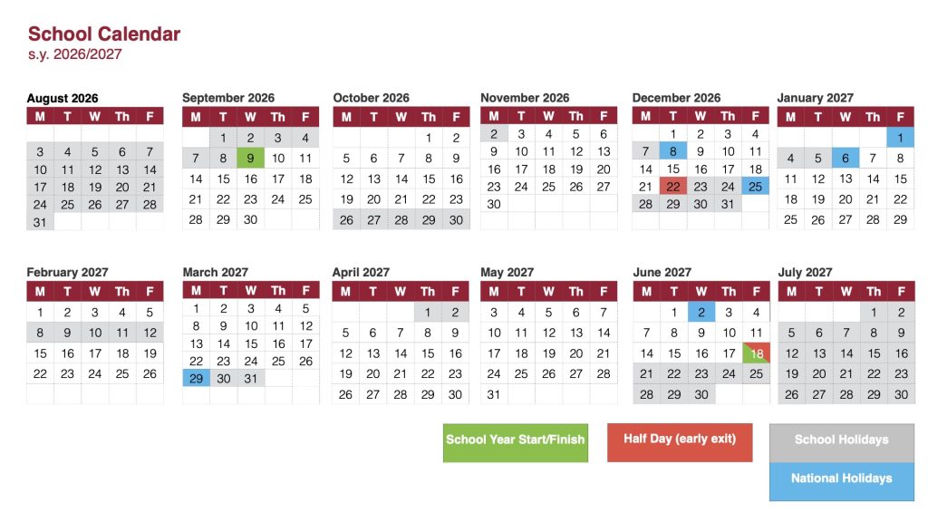 The calendar includes key dates such as term start and end dates, holidays, national holidays and school closures. We encourage families to review the calendar carefully and save the relevant dates for future planning.